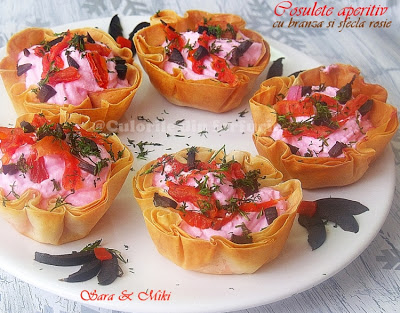 Pentru Cosuletele aperitiv din foile de placinta, gasiti medota AICI. Umplutura din crema de branza este foarte simpla. Se amesteca cu mixerul, branza, smantana, sucul de sfecla, sare, piper si cimbru.