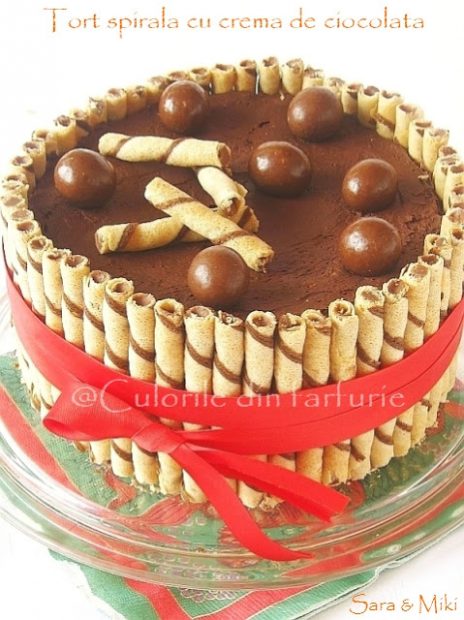 Pentru decor am imbracat pe lateral tortul in rulouri de napolitana, care ii dau un efect special. Rulourile se gasesc de cumparat in supermarket.