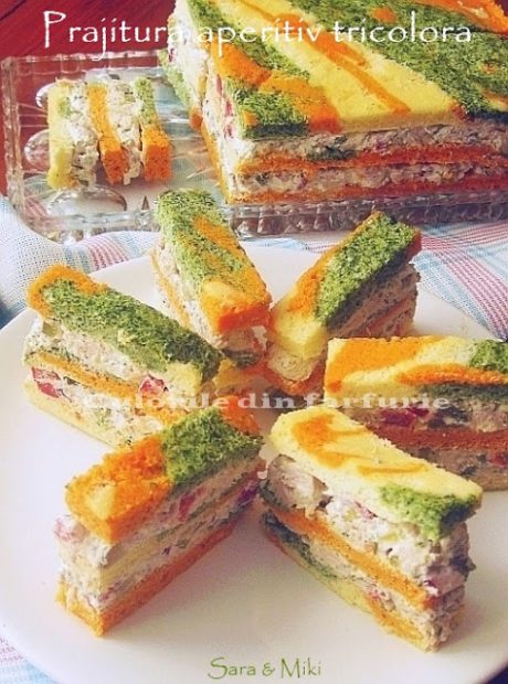 Pe principiul retetei Rulada aperitiv tricolora, un aperitiv de efect dar si foarte bun si care s-a bucurat de un real succes printre vizitatori blogului meu, am realizat acum alta varianta sub forma unei prajituri aperitiv cu umplutura din crema de branza si carne de pui. Veti intelege pe parcurs din explicati si din imagini.