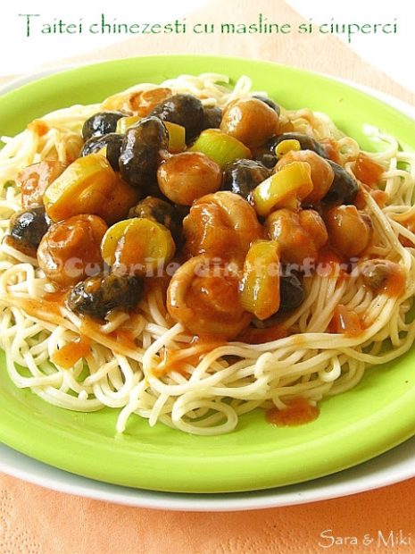 Acesti taietei chinezesti se pot pregati in multe moduri, cu sosuri din diverse amestecuri de condimente chinezesti, impreuna cu legume carne sau fructe de mare. Eu azi i-am servit langa un sos de rosii cu ciuperci si masline.