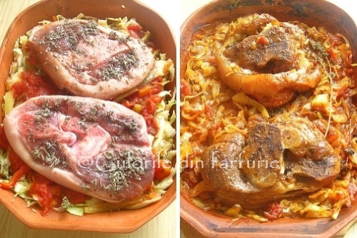 Se condimenteaza cu sare si piper dupa gust si se presara cu cimbru. Se adauga ulei, usturoiul, foile de dafin, rosiile cuburi din conserva, vinul si apa cat sa acopere pana la jumatate. Se acopera cu capacul si se da la cuptorul preincalzit pentru o ora la foc potrivit.