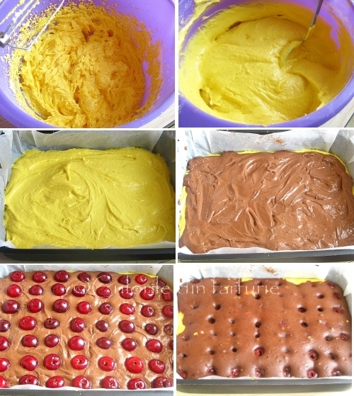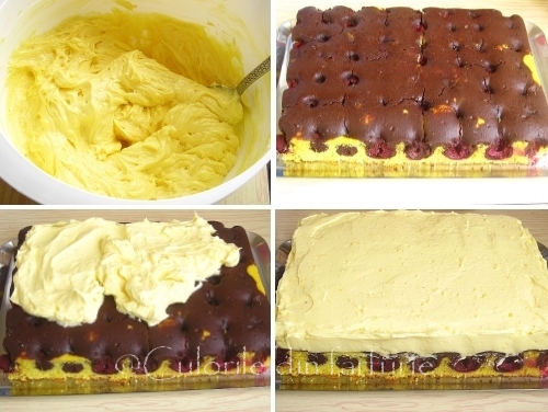 Visinele fara samburi dupa ce se scurg bine de sirop, se repartizeaza uniuform in tava peste aluatul maron, apasand usor. Se coace in cuptorul preincalzit la 170 °C pentru 30-40 de minute.