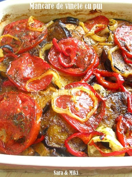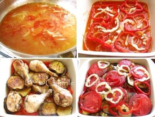 Intr-un vas de ceramica sau de yena se pune jumatate din sosul cu ceapa, se adauga un strat de rondele de vinete, unul de ardei si rosii taiate rondele. Asezam deasupra bucatile de pulpe. Se repeta operatia adaugam restul de sos de ceapa si se continua cu straturi de vinete, ardei si rosii. Se presara si patrunjel proaspat tocat.