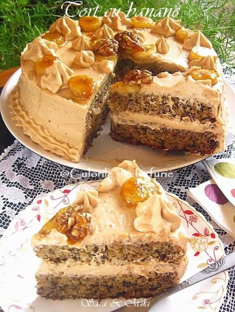 Tort cu blat cu banane, crema caramel si banane caramelizate, cred ca din titlu ati inteles ce nebunie este acest tort. De cand am facut Chec cu banane (Banana Bread) care mnoua ne-a placut tare mult, mi-am propus si un tort. Mi-a placut ce a iesit, totul este o aromade banana. Va invit sa-l incercati, asta daca va plac bananele. S-ar putea sa va placa si Tort cu mousse de bananae.