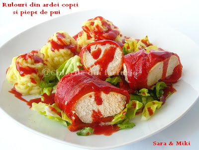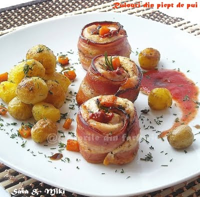 Rulouri de pui invelite in bacon cu piure de telina si sos de mustar