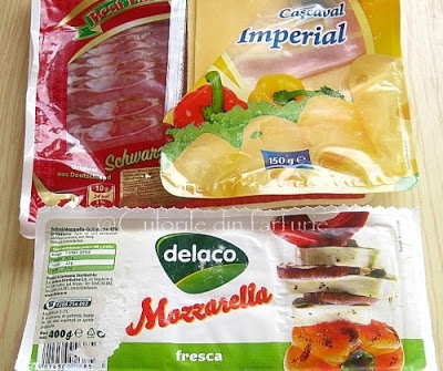 Pentru umplutura avem nevoie de mozzarella, sunca Padurea Neagra (asta am folosit eu, dar merge orice sunca afumata) sau bacon si cascaval felii.