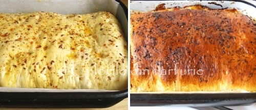 Cand s-a dospit, pe o masa fainata se intinde aluatul sub forma de dreptunghiu. Se presara intai pe toata supratata condimente Fuchs cu ardei si tomate si sare dupa gust.