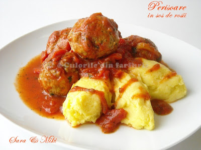 Cand sosul incepe sa fiarba, se adauga perisoarele si condimentele. Se completeaza cu suc de rosii cat sa acopere chiftelutele si se potriveste de sare. Se acopera cu un capac si se lasa sa fiarba inabusit 15 minute, amestecand din cand in cand. Se servesc alaturi de un piure de cartofi.