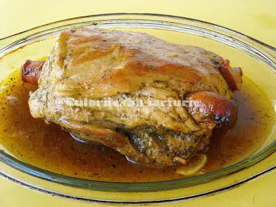 Se introduce la cuptor, pentru o ora si 15 minute. Dupa o ora se scoate folia si se mai lasa la cuptor ca sa prinda culoare. Cand carnea este gata se aseaza pe un platou, se acopera si se lasa la odihna 15 min. si doar dupa aceasta se taie felii.
