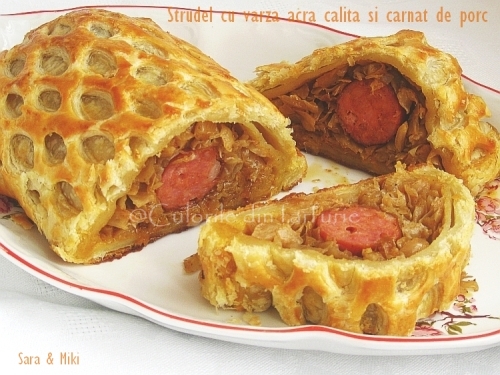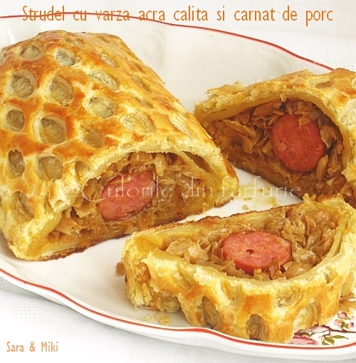 Strudel cu varza acra calita si carnat de porc este un preparat pe gustul familiei mele. Cum in frigider trona un canat de porc, niste varza calita ramasa de la alt meniu si aluat de foietaj, care mie nu-mi lipseste din congelator, asa a aparut acest Strudel, nu foarte mare, dar pentru 2-3 persoane flamande … este tare bun.