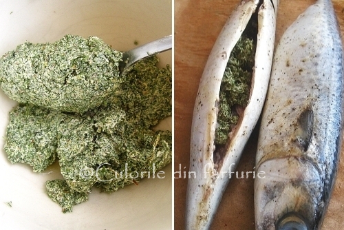 Condimentam cu sare si piper dupa gust. Am folosit acum condimente uscate, dar in curand cu invierea naturii, vom folosi verdeturi proaspete. Cu acest amestec umplem burta pestilor.
