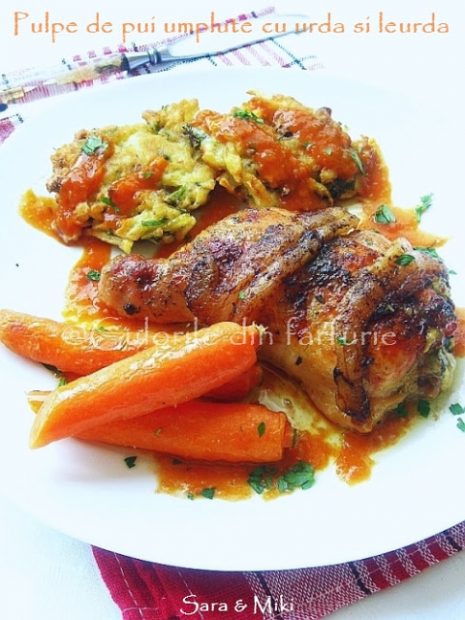 Drept garnitura am servit aceste pulpe umplute alaturi de baby morcovi brezati in unt si putin vin alb si Rösti, acele minunate chiftelute din cartofi. Reteta lor o gasiti AICI. Totul a fost stropit cu sos de morcovi. A fost un deliciu, va garamtez si va invit sa incercati. Pofta buna!