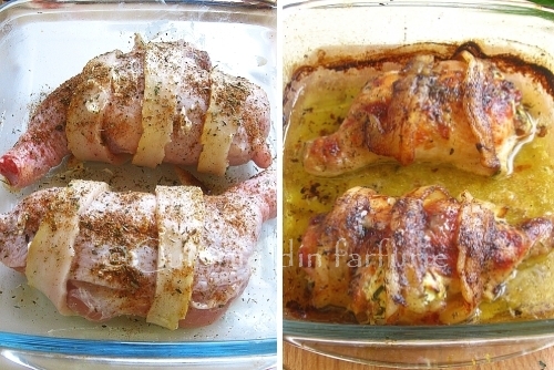 Se scot pulpele din frigider si le umplem cu amestecul de urda si leurda. Inchidem pulpele si le prindem in 2-3 scobitori pe fiecare. Le infasuram cu 2-3 fasii de slanina afumata de casa. Ideea slaninei este ca sa intre aroma de afumatura in carnea de pui.