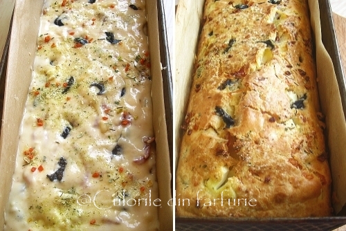 Tapetam o forma de chec cu hartie de copt si turnam compozitia. O dam la cuptor, la foc mediu, cca 40 minute si checul devine rumen.