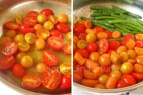 In sosul lasat de friptura se soteaza legumele. Intai se soteaza rosiile cherry intregi sau jumatati. Fasolea verde pastai si baby carrots congelate se dau in clocot pana devin aldente, apoi se adauga peste rosii.
