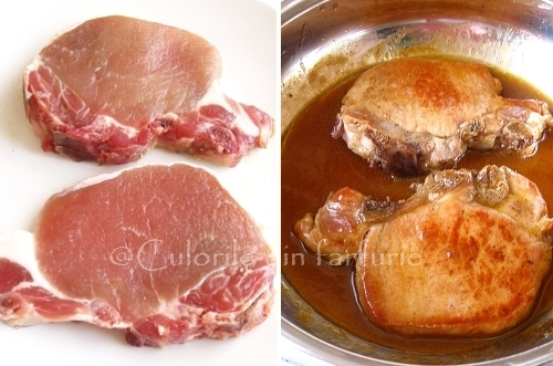Presaram cu sare si piper, apoi dam la cuptorul incins la 200 °C pentri 25-30 minute. Timpul de preparare depinde de grosimea cotletelor. Folosind o perie de patiserie le ungem din cand in cand, apoi la jumatatea intervalului le intoarcem, adaugand si vinul.