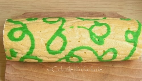 Dupa ce se scoate tava din cuptor pe un prosop umed rasturnati blatul si deslipiti cu grija hartia. Se vor vedea frumos urmele lasate. Se ruleaza apoi si se lasa 15-20 minute sa se raceasca. Se intinde rulada din nou si deasupra se pune umplutura. Rulam strans si o infasuram in folie de plastic.