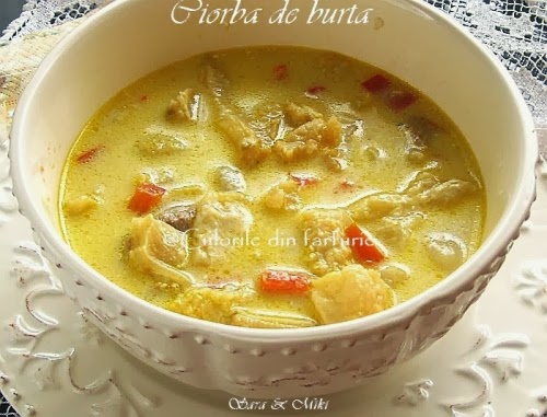 Burta si carnea de pe oase se taie in felii si se adauga in supa strecurata si se mai da iar vasul la foc.