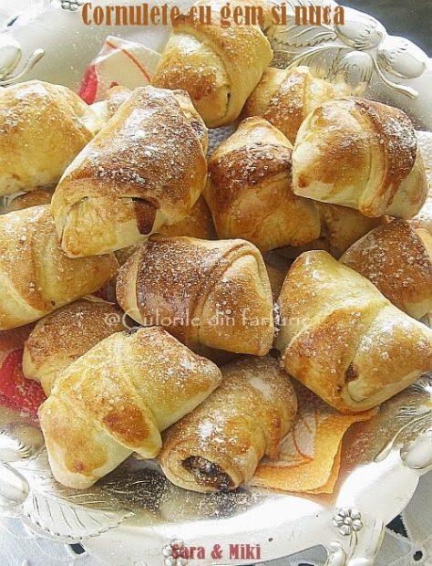 Cornuletele cu gem si nuca sunt foarte cunoscute alaturi de cele cu rahat. Sunt un dulce minunat cand nu ai timp pentru ceva mai elaborat sau cand esti in lipsa de idei. Se fac rapid, sunt spornice si ti se topesc in gura.