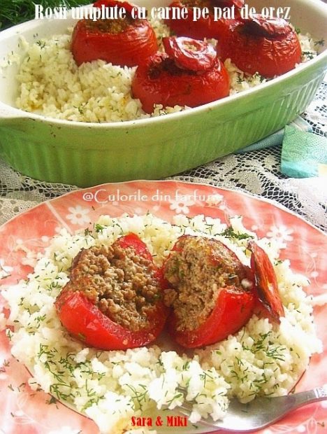 Rosii umplute cu carne pe pat de orez, putin diferit fata de o alta reteta postata deja: Rosii umplute cu carne de carnati, dar la fel de buna si apetisanta. Sunt mancaruri de sezon ca si Ardei umpluti cu carne, acum cand pietele sunt pline de aceste legume prospete.