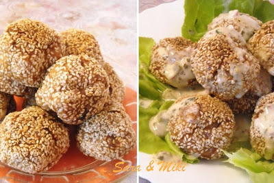 Se adauga si verdeata si pesmetul, cat sa se lege si sa devina o pasta consistenta. Se da la rece 1/2 ora, apoi se formeaza bilute care se tavalesc prin seminte de susan.
