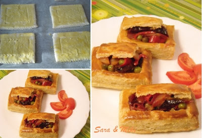 Taiati julien ardei rosu si verde, morcov, mazare, rosie, ceapa, sfecla rosie, verdeata…sarati, piperati. Cu aceasta compozitie se umplu pachetelele.