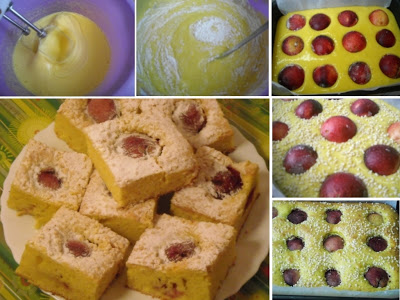 Deasupra se aseaza uniform jumatatile de prune (trecute prin faina ca sa se mentina la suprafata), astfel incat la taierea prajiturii, fiecare bucata sa contina cate o jumatate de pruna pruna..