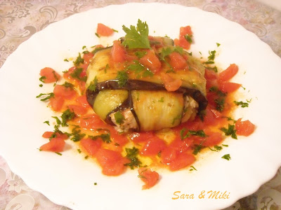 Separat, feliile de vinete se prajesc in ulei. Dupe ce le-am pus pe hartie absorbanta, incepem sa formam pachetelele. Feliile de vinete se pun in cruce cate doua. In centru intersectiei, se pune din amestecul de carne, la aprecierea fiecaruia.