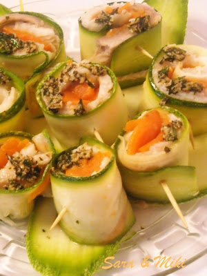 Se aleg fasiile de dovlecel, morcov si fileurile de peste de aceeasi latime si lungime, se suprapun si se ruleaza. Se strapung cu o scobitoare ca sa nu se desfaca.