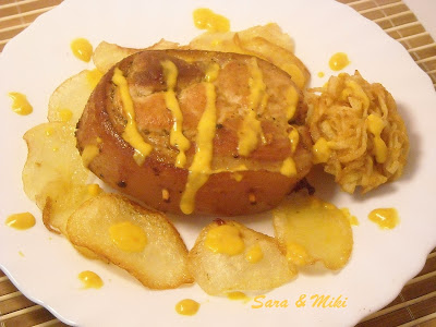 Catre sfarsit se rupe punga, fara sa scoatem pulpa si mai lasam 10-15 minute. Se serveste cu orice fel de garnitura, piure de cartofi sau orez impreuna cu sucul propiu, in care mai adaugam, dupa gust, putin mustar.