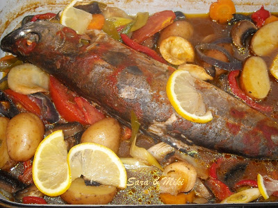 Într-o tava potrivit de mare, se aseaza pestele, apoi ceapa, morcovul, radacina de patrunjel, usturoi şi ardei cu un pic de ulei de măsline.