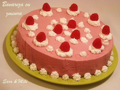 Bavareza, denumirea vine din fraceza „bavarois” si este o crema preparata asemanator cu sarlota, pe baza de crema englezeasca si cu adaos de gelatina, frisca si diverse arome sau pulpa de fructe. Eu am folosit acum zmeura. Sper sa va placa.