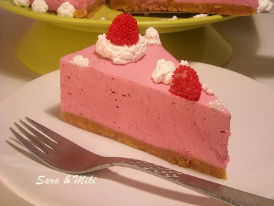 Daca e cazul se strecoara, apoi se adauga gelatina inmuiata in apa rece, se lasa 10 min, dupa care se adauga frisca batuta si pulpa de zmeura. Se mai lasa sa se raceasca putin, apoi se rastoarna peste blatul de biscuit.