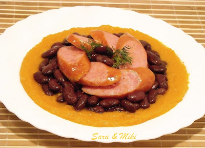 Platoul pentru servit se aranjeaza ca in imagini. Intai piureul de morcovi, apoi fasolea rosie deasupra si peste, carnati taiati si aranjati in evantai.