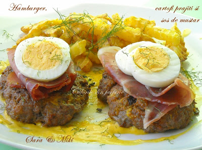 Hamburger, cartofi prajiti si sos de mustar
