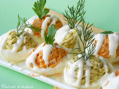 Umplutura cu branza si boia dulce: La fel ca cealalta umplutura galbenusurile se zdrobesc cu o furculita si se amesteca cu branza feta si maioneza. Se pune sare, piper si boia dulce. Se incorporeaza cateva fefi de sunca taiata cubulete mici.