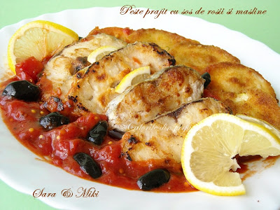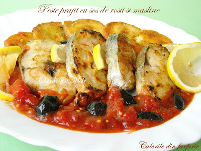 De obicei, pestele prajit se serveste cu o mamaliga, alaturi de un mujdei de usturoi. De data asta am servit pestele alaturi de un sos de rosii cu masline. Pentru sos, se incinge tigaia cu ulei, se adauga rosiile decozite, fara sanburi si taiate in cuburi.