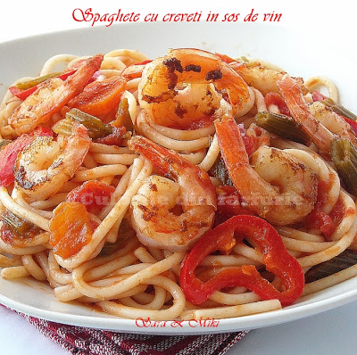 Imi plac spaghettile, imi plac crevetii, dar cu sos de vin n-am facut niciodata. E adevarat ca eu imbat orezul cu vin alb cind fac pilaf, iar farfurioara asta e cum spun italianii "molto invitante"… Pupici si-o duminica frumoasa !