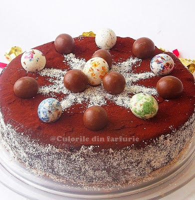 A doua zi se scoate folia, se rastoarna pe un platou si se imbraca in ciocolata. Se poate orna cu cocos si diverse figurine din zahar sau ciocolata. Eu aveam niste bomboane.