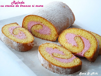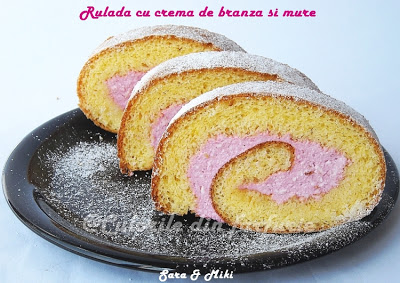 Cat se raceste se face umplutura de branza. Intr-un bol se mixeaza branza, frisca, zaharul fin si siropul de mure. Eu am avut un sirop gros, ramas de la o dulceata din mure.