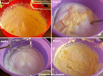 Se amesteca cele doua creme pana devin omogene (poza 3). Se amesteca faina, scortisoara, praful de copt si bicarbonatul. Apoi se incorporeaza in crema alternand cu smantana (poza 4).