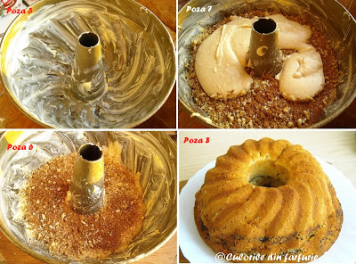 Se unge o forma de guguluf cu unt (poza 5). Se pune o treime din aluat. Se presara jumatate din amestecul de umplere (poza 6).