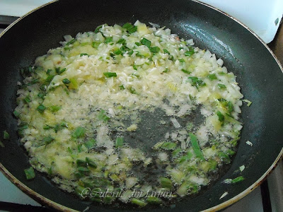 Se distuie ceapa in ulei cu putina apa. Apoi se adauga orezul si se mai lasa cateva minute.