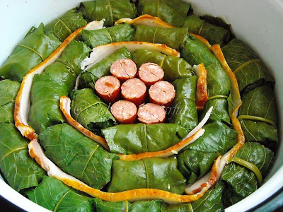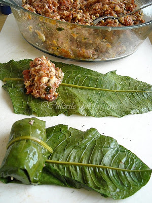 Saptamana trecuta am gasit in piata foi frumoase de stevie si asa ne-am delectat cu acesta reteta minunata. Umplutura este un amestec de carne tocata si urda, iar sarmalutele sunt fierte in bors.