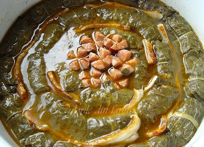 Pe fundul cratitei se pun 2-3 frunze, dupa care sarmalutele se aranjeaza cercuri concentrice, sau randuri-randuri, iar intre ele se adauga afumatura taiata fasi si tijele ramase de la marar. Merge bine chiar marar uscat, ii da sosului o savoare aparte.in centru se aseaza carnaciori.