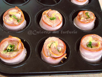 Se acopera cu o verdeata. Eu am pus frunze de patrunjel. Dupa aceea se ruleaza si se prinde intr-o scobitoare, daca e cazul. Se repeta pana se termina si carnea si baconul. Pentru a fi date la cuptor se aseaza in forma de muffins / briose.