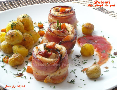 Ceva similar si poate si mai bun iese daca in pieptul intins pe sunca se pune putin morcov ras si feliute fine de ardei, cu ocazia asta introducem si ceva legume