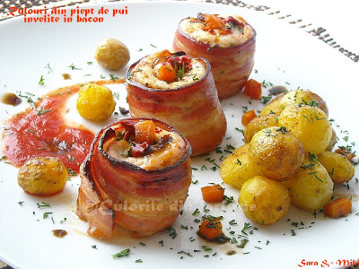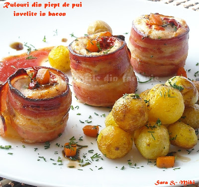 M-an gandit cum sa denumesc reteta, ca sa scot in evidenta modul de preparare, adica in forma de muffins / briose. Am vrut sa apara in denumire, dar sigur s-ar fi inteles ca sunt muffins cu pui si bacon, ceea ce este foarte departe. Asa ca am lasat simplu, Rulouri din piept de pui invelite in bacon.