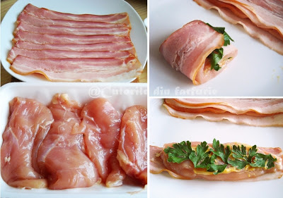 Pieptul de pui se spala bine, de dezoseaza, daca este cazul. Se inparte in cei doi lobi. In functie de marimea lobilor se taie in fasii pe lungime, groase de 1.0-1.5 cm grosime si late de latimea feliilor de bacon.