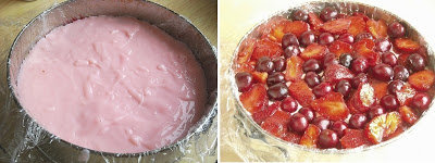 Cand s-a intarit se aranjeaza deasupra ciresele si capsunile. In sucul lasat de la fructe, se adauga gelatina pregatita ca mai sus.